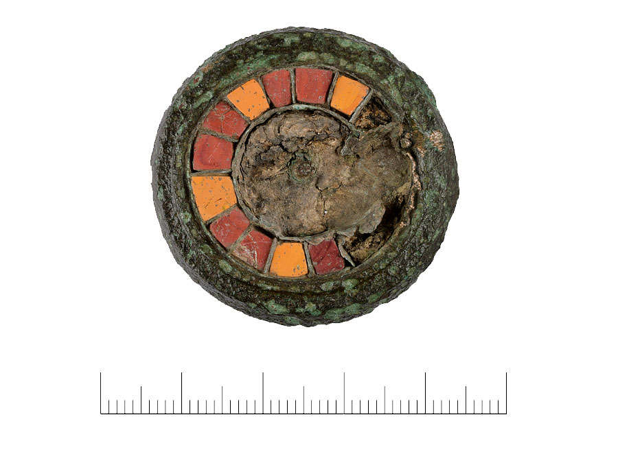 Nästa spänne som presenteras är ett av de lite mer ovanliga fynden som gjordes 2016. Det är ett så kallat skivspänne med insättning av emalj i röd och orange färg och något som bedömts utgöra pärlemor eller musselskal i mitten av spännet.